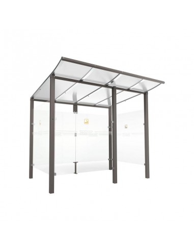 Tube acier 70 x 70 mm - Toiture profilés en aluniminum anodisés, traverses en tube acier 40 x 40 mm et panneaux en polycarbonate alvéolaire ép 10 mm traité anti-UV - Bardages de façade, de côtés et de fond : verre sécurisé épaisseur 5 mm avec signalétique- Finition peint/galva selon nos ral - Pose par scellement direct