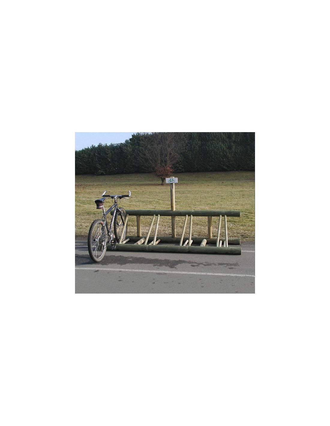 Pin traité autoclave classe IV - Structure en rondin diam. 10 cm. Pictogramme vélo sur plaque PVC - Livré avec accessoires de scellement - Pré monté - Longueur : 2215 x 750 x 600 mm