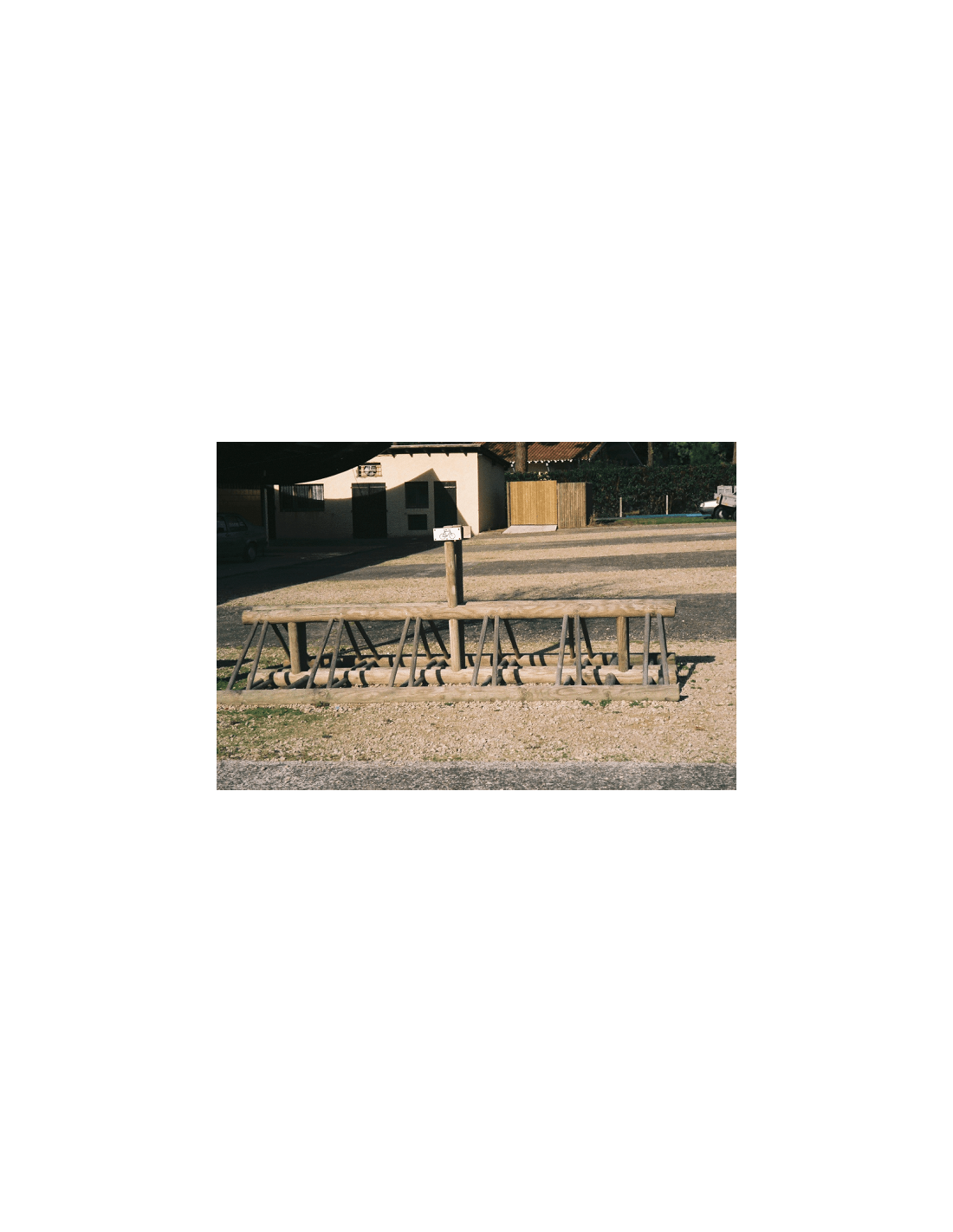 Pin traité autoclave classe IV - Structure en rondin diam. 12 cm. Pictogramme vélo sur plaque PVC - Livré avec accessoires de scellement - Pré monté Dim : 3420 x 750 x 600