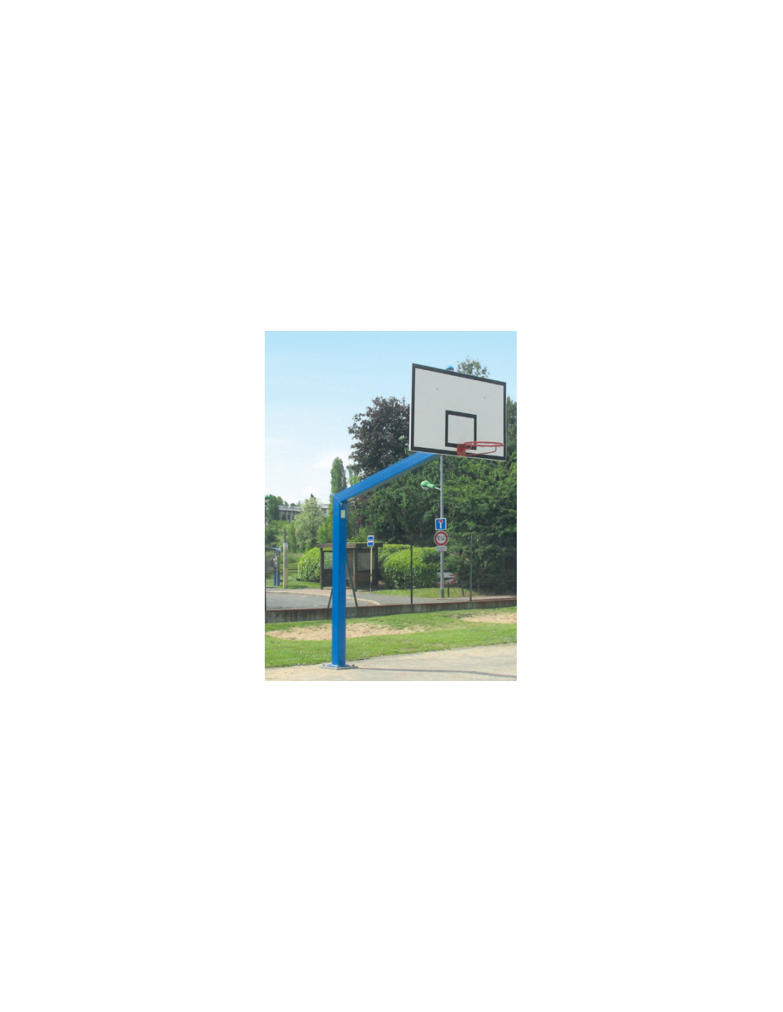 Conforme Norme NF EN 1270 - Tube acier galva monobloc ø 114 mm plastifié blanc - Panneau PE 1/2 lune 1120 x 775 mm - Cercle renforcé et filet fil ø 5 mm - Gousset de renfort - Fixation par scellement direct- Vendu à l`unité Hauteur sous cercle: 3,05 m - Déport : 2,25 m