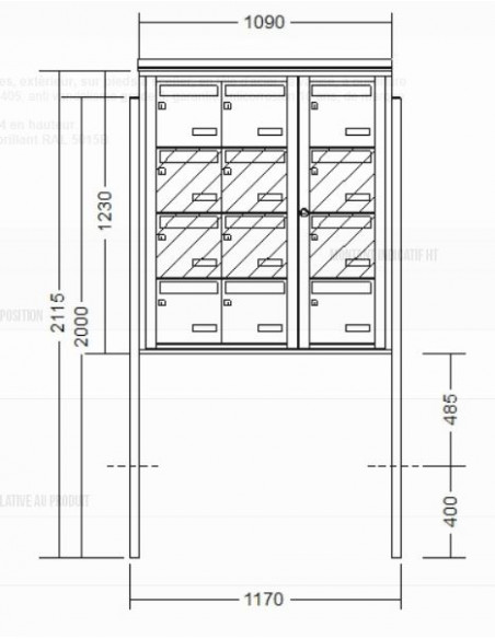 Conforme norme NF D 27-405 - Agréé La Poste - Tôle acier galva - Anti-vandalisme grade - 4 boîtes en largeur x 3 boîtes en hauteur - Peinture polyester selon RAL standards - Toit incliné à 5° - 2 clés fournies - Sur pied à sceller sur 400 mm