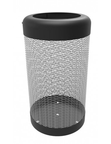 Tôle d`acier galvanisée - Anneau intérieur pour fixation du sac - Fermeture clé triangulaire - Base et tête RAL 9005 - Tôle grillagée RAL 9006 - Trou sur le fond pour évacuation des eaux pluviales - Fixation au sol par tige filletée non fournie - Volume 140 L