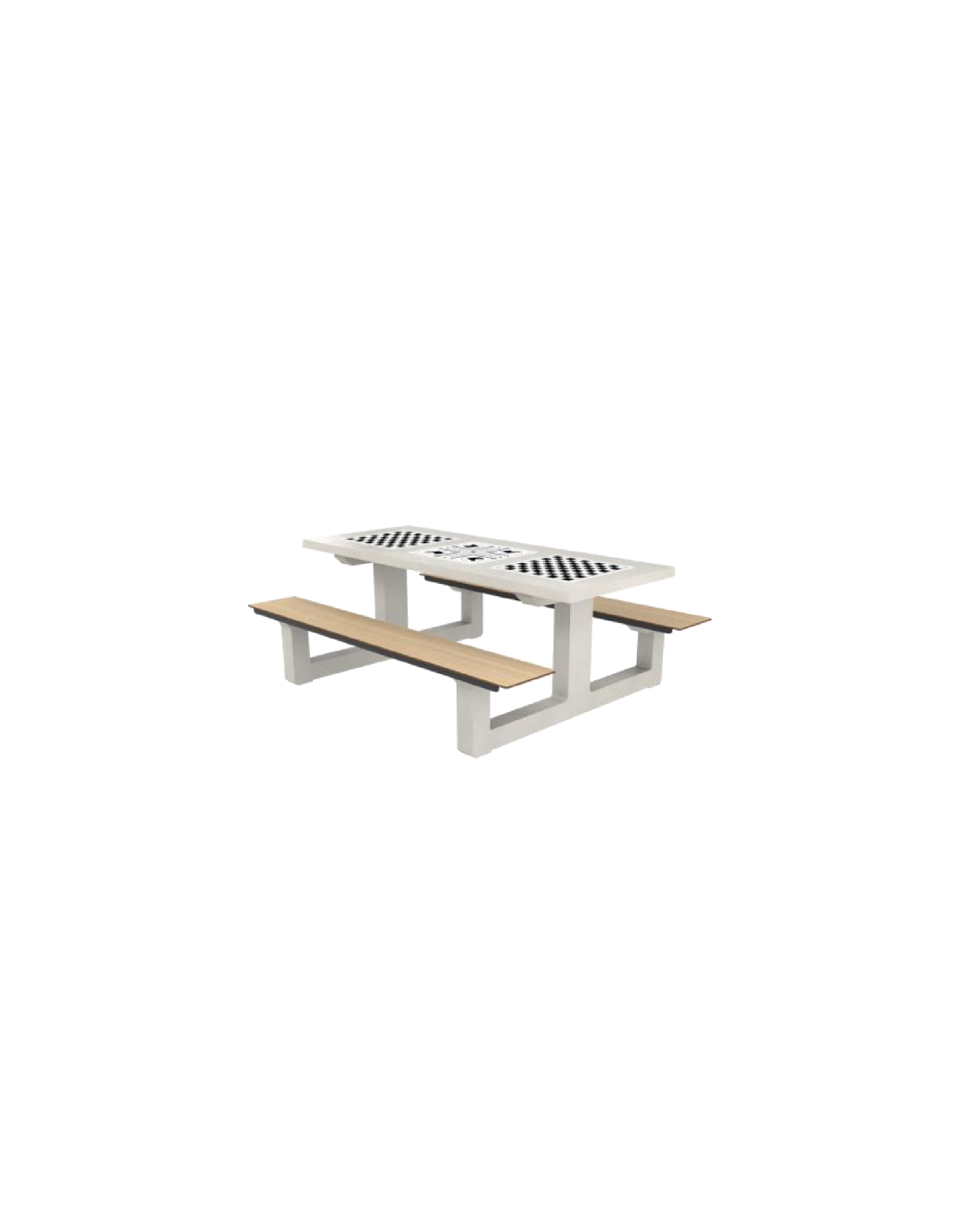 Table extérieure avec assises intégrées et 3 jeux – structure monobloc à fixer au sol – Capacité : 6 places – Plateaux de jeux intégrés : dames, échecs et petits chevaux – Matériaux : Structure en béton teinté blanc sablé, assises et plateau en compact HPL finition chêne clair, éléments en acier traité anticorrosion et poudré anti-UV – Robuste, résistante aux chocs, aux intempéries et adaptée aux zones à forte fréquentation – Faible entretien – Fixation : en 4 points – Garantie : 10 ans