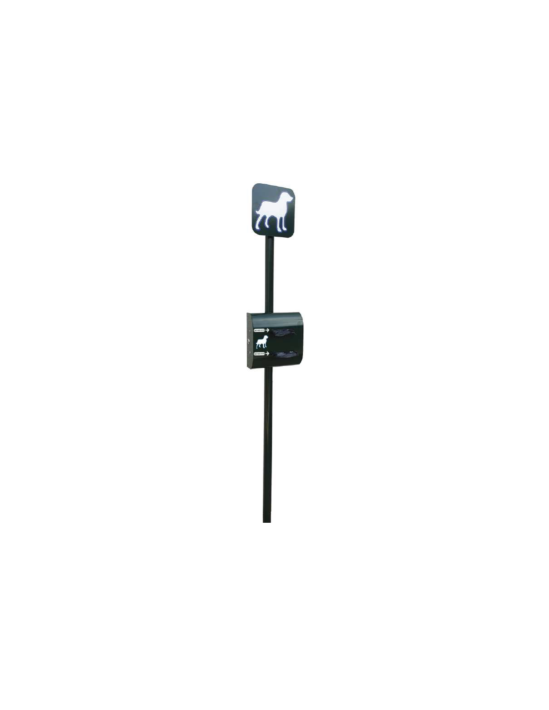 Borne de propreté canine avec distributeur rouleau double – Kit complet comprenant un haut de mât signalétique, un mât et un distributeur – Haut de mât assurant une visibilité à plus de 100 m – Mât en acier diamètre 60 mm en deux parties – Distributeur double rouleau robuste et fonctionnel permettant un changement rapide des consommables – Capacité doublée de 400 sachets (2 rouleaux) pour une fréquence de remplissage réduite – Système de distribution unitaire par stop bag en caoutchouc – Double verrouillage sécurisé par clé triangulaire fournie – Compatible avec tous types de sachets canins – Structure avec résistance accrue à la corrosion – Finition peinture coloris RAL 6009 (autres coloris RAL disponibles en option) – Fixation à sceller (hauteur totale 2500 mm) ou sur platine en option
